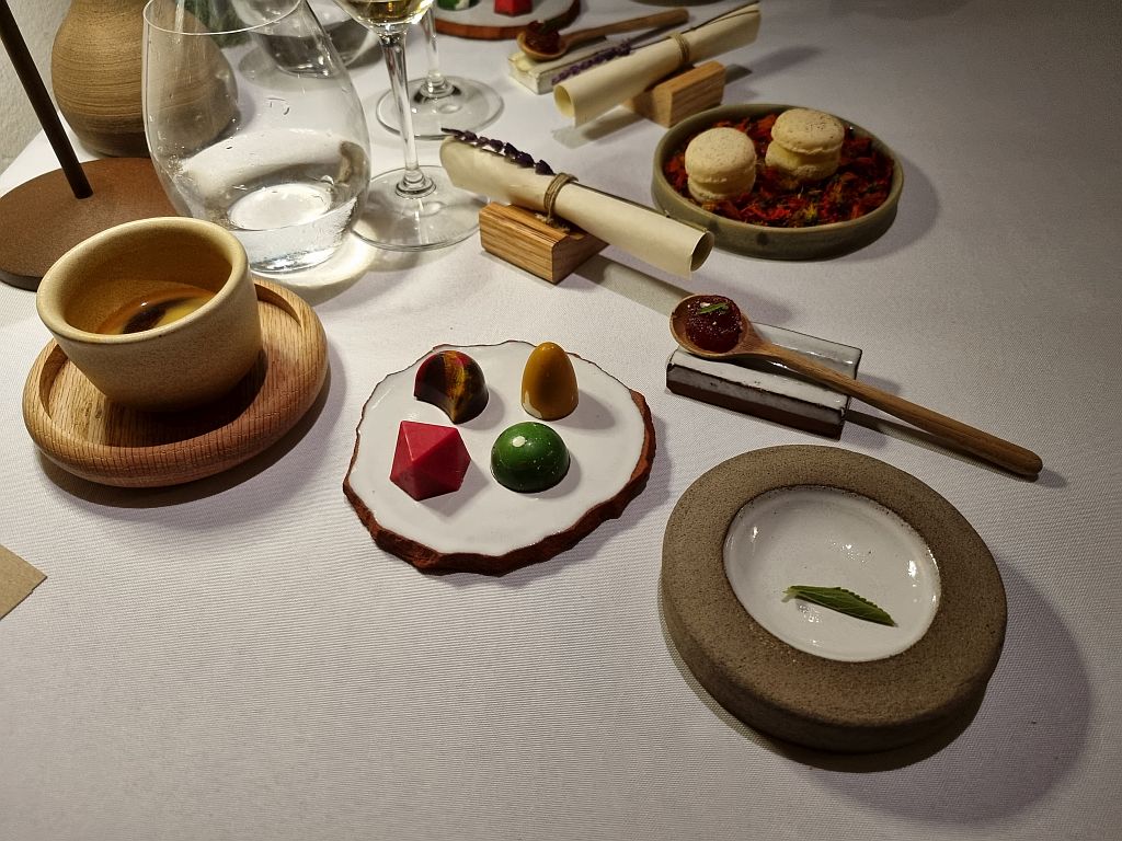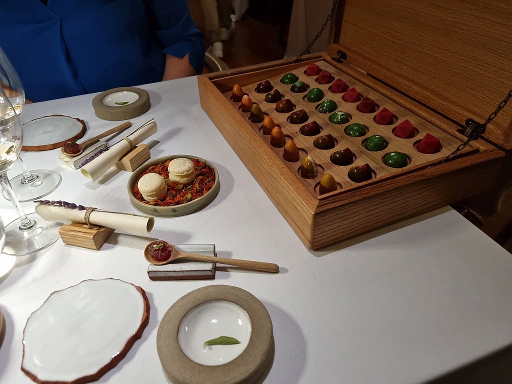 Dazu Macaron und ein Löffel mit Fruchtcreme, was eine schöne Reminiszenz an den Anfang des Menüs darstellte. Bei den Pralinen konnte man so viele aussuchen, wie man wollte. Also einmal von jedem.