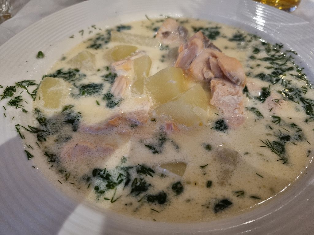 Gefolgt von einer sehr wärmenden Lachs-Creme-Suppe mit einer enormen Menge Dill.