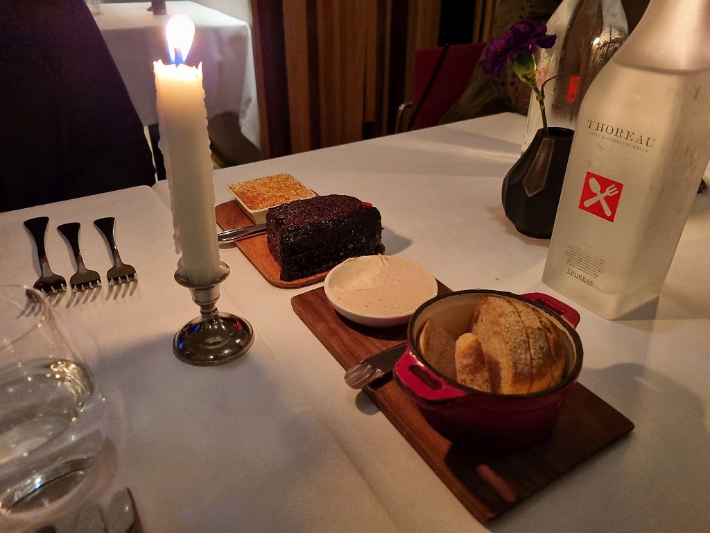 Danach kam, recht ungewöhnlich, Brot. Und zwar zweimal: Einmal Sauerteig (gut) und einmal ein ein in Lakritz-Zucker getauchtes Roggenbrot (wahnsinn). Dazu eine Salzbutter mit Pilzstaub und eine Paprika-Butter.