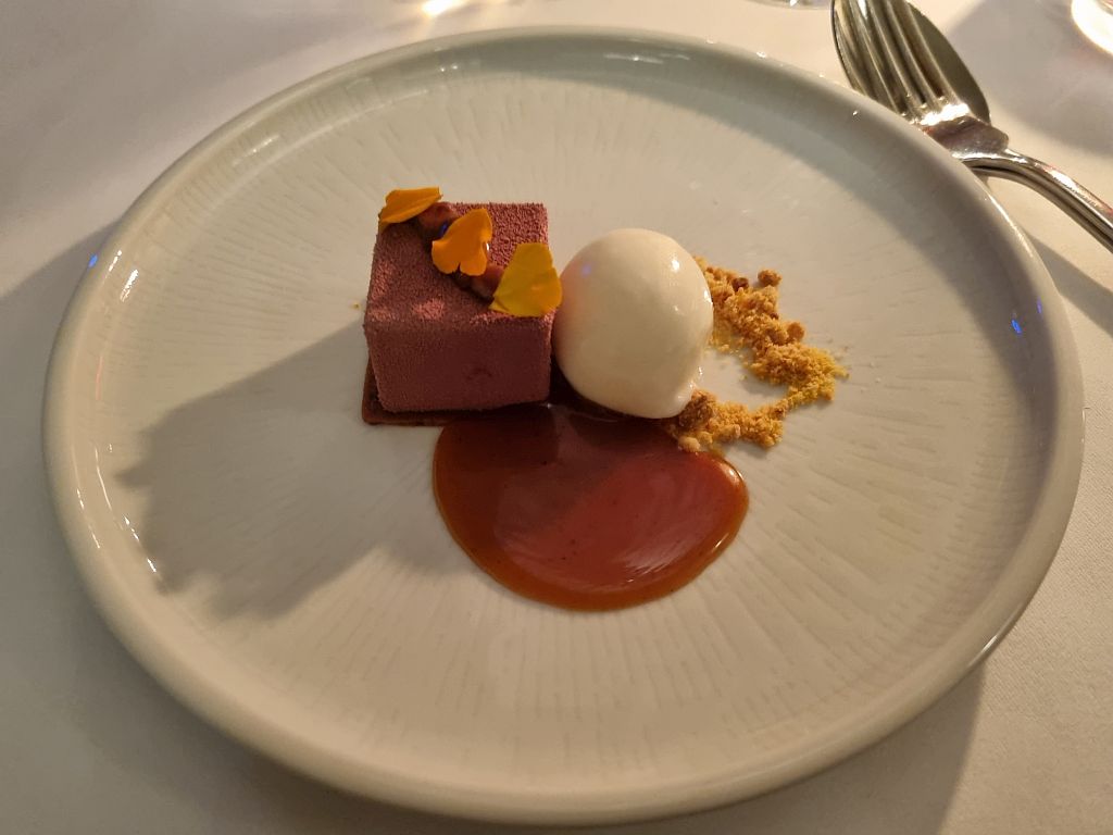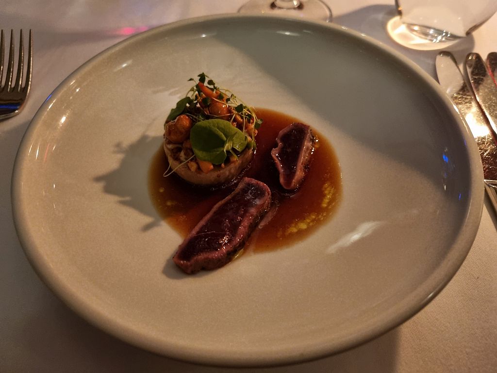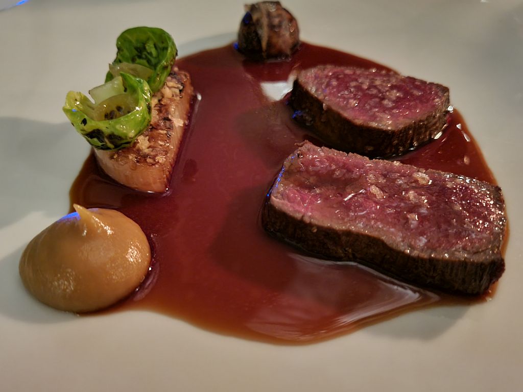Zeit – leider! – für den Hauptgang, wo finnisches Wild und Beeren einen sehr lokalen Touch brachten. Es gab rosa gebratenen Hirschbraten, Zwiebel in sauer eingelegter und pürierter Form sowie eine unglaublich starke Madeirasauce mit fermentierter Himbeere.
