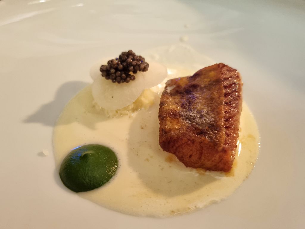 Und der nächste Gang machte es nicht schlechter: Ein hervorragend gebratener Zander (gebratene Haut – we love it!), dünne Kohlrabischeiben, Kaviar, Spinatcreme und eine Buttersoße, die das genaue Gegenteil einer Diätküche ist.