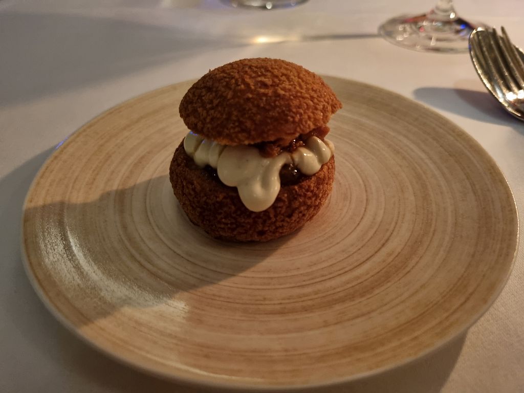 Als quasi Pre-Dessert (immer noch ein schönes Konzept!): Ein Profiterol mit einer Creme aus Stilton sowie ein bisschen Birne und ein paar karamelisierte Mandeln.