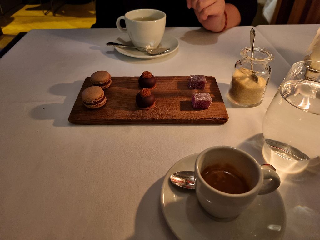 Ein schöner Abschluss dann, wie immer, mit einem Espresso, Tee und jeweils drei Petit Fours.