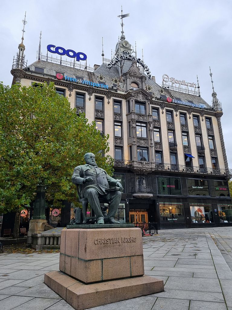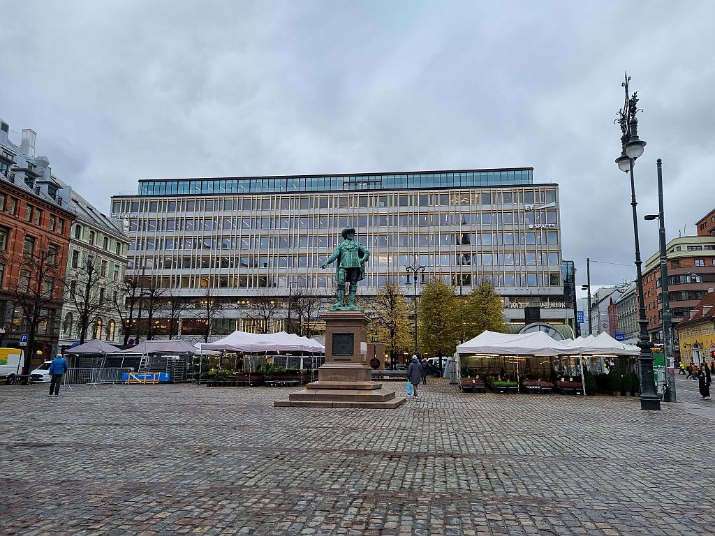 Weiter ging es zum Stortorvet, dem großen Platz Oslos. Neben ein paar, sehr spärlich besuchten Marktständen, steht hier eine Statue von König Christian IV.. Dieser hatte diesen Platz angelegt, obwohl er damals außerhalb der Stadt lag. Auf seinem Sockel kann man lesen „Hier soll die Stadt entstehen.“.