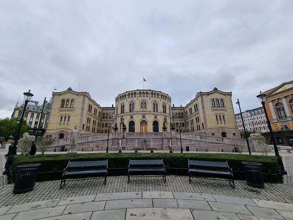 Nächster Halt: Das Stortinget, das Parlament Norwegens. Das Parlamentsgebäude gegenüber eines Parks wurde von 1860 bis 1866 erbaut. Die 50 Jahre vorher verbrachte das Parlament in Privathäusern, Schulen und angemieteten Sälen der Universität.