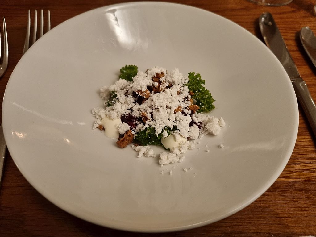 In Summe war es also nicht wirklich weniger Menge. Und konkret im ersten Gang dann auch noch gemein, denn der war echt gut: Gepökeltes Wild mit Preiselbeeren, Haselnuss, Grünkohlblättern und einem wahnsinnig gut passenden Meerrettich-Malto-Schnee.