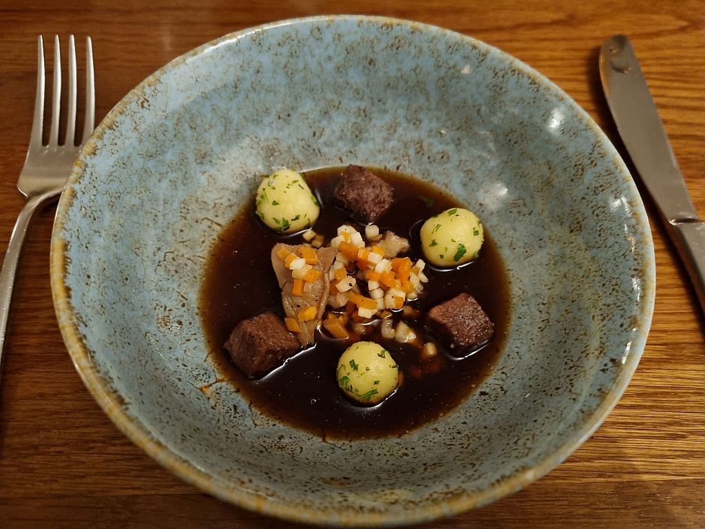 Beim perfekt herbstlichen Gang mit der Consommé aus Ochsenschwanz und Pilzen, die auf die zarte Kalbszunge, die Knocchi und die zu Brunoise geschnittenen Wurzelgemüse sowie einem echt leckeren Shiitake gegossen wurde, war dann aber die Welt wieder in Ordnung.