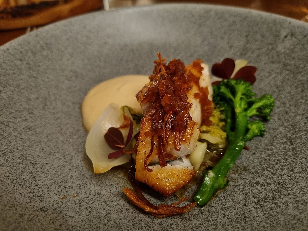 Weiter: Gebratener Seelachs, recht hell, mit Zwiebel-Espuma, Brokkoli, Fenchel, Kohl und brauner Butter mit Sojasauce versetzt.