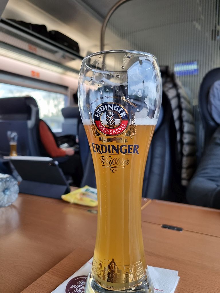 In Hamm hieß es dann „Wir warten auf den Zugteil aus Düsseldorf!“ und kurz danach „Wir warten nicht mehr!“. Dieses Hin und Her machte durstig und da die meisten der vorgenommenen Aufgaben erledigt waren, bestellten wir uns ein schnelles Weißbier. Irgendein Vorteil muss die erste Klasse ja haben.