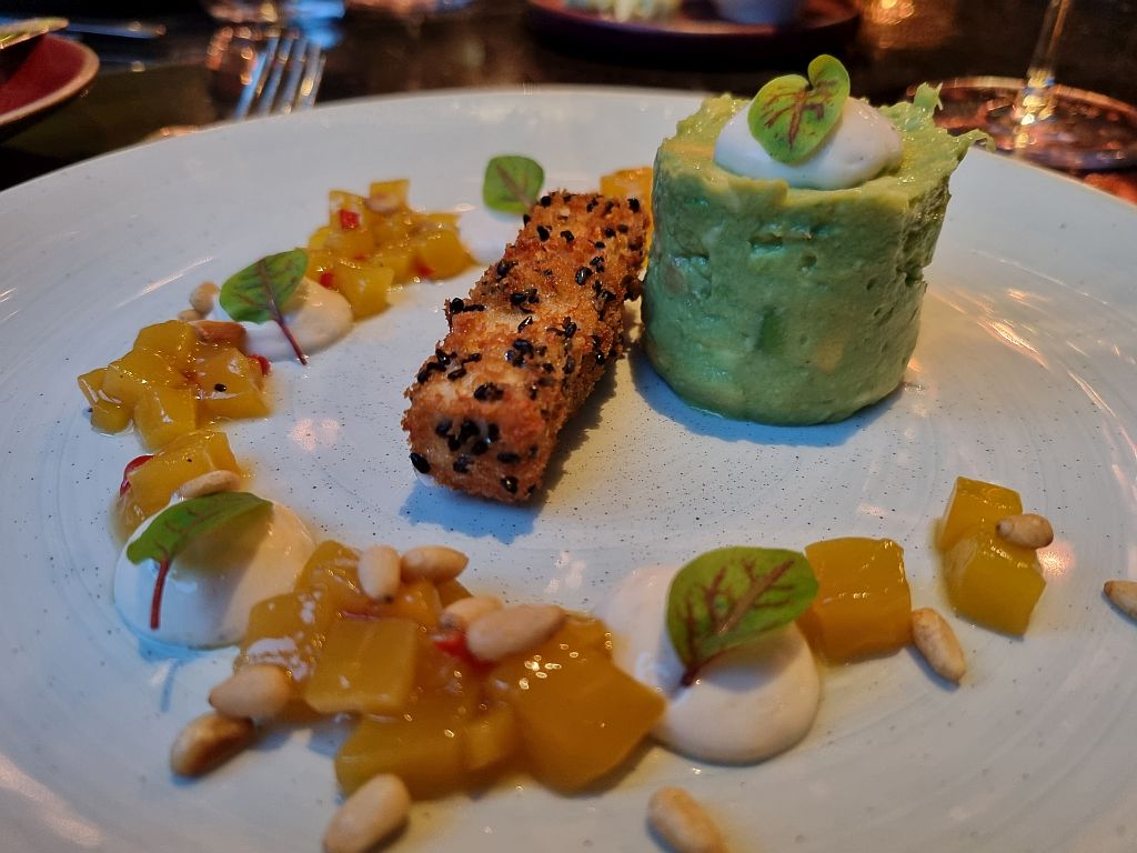 Und das Essen a la carte war auch schon recht ambitioniert und hatte relativ wenig mit einem Hotel-Restaurant zu tun: Lachs mit Avocado-Creme, Mango, Pinienkerne und Blumenkohl-Creme.