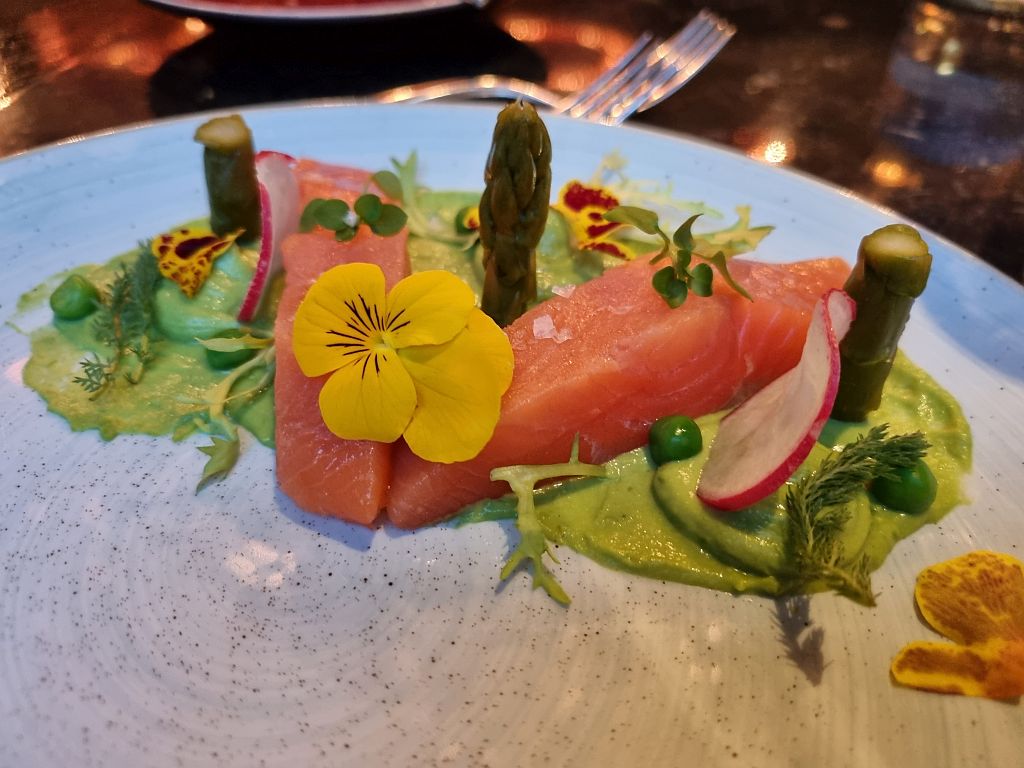 Oder bei Jens ein gebeizter Lachs mit Erbsenpüree, Spargel und Blüten.