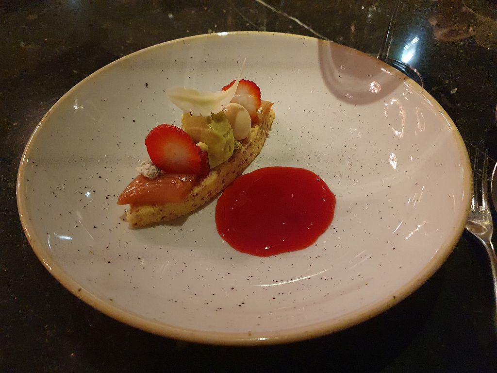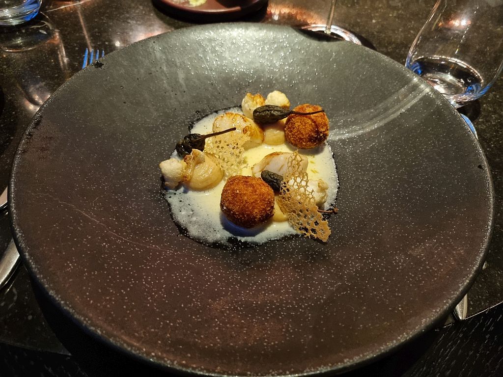 Gleiches galt für den Zwischengang, wo wir uns für Jakobsmuscheln mit Blumenkohl, Kapern (sehr leckeren übrigens) und kleinen Pralinen mit Garnelen entschieden haben. Zumindest Jens hat dies und war nicht unzufrieden mit seiner Wahl.