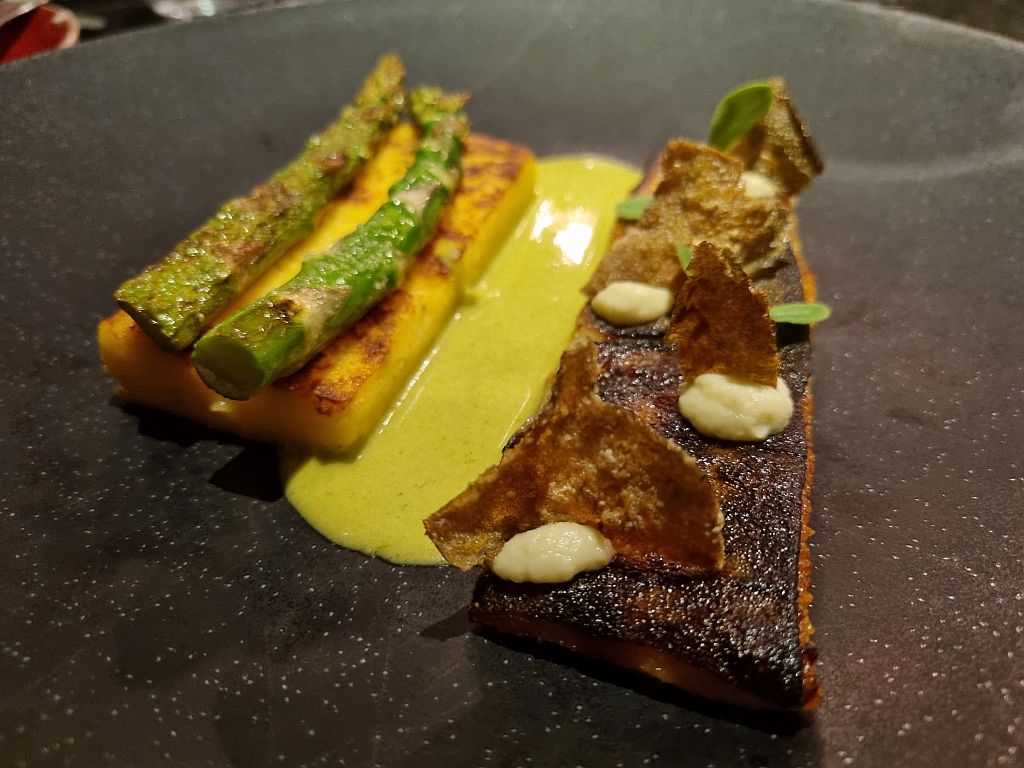 Zeit für den Hauptgang: Saibling mit Polenta, Creme und (natürlich) Spargel.