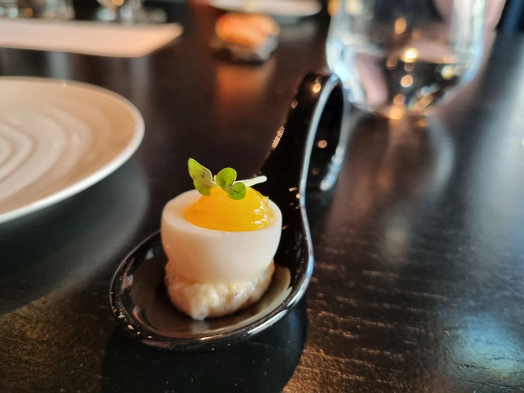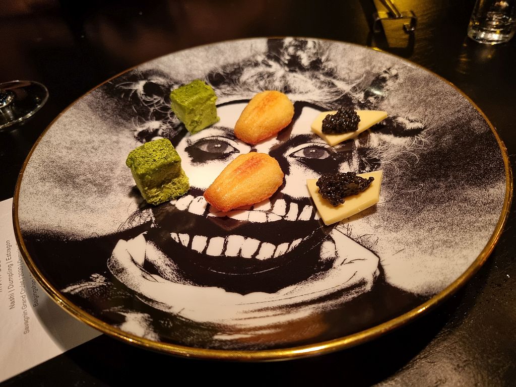 Es gab einmal ein Schaum aus Matcha, soweit, so klar. Ein Madelaine ist uns jetzt auch nicht unbekannt. Kaviar auf Käse und das zum Nachtisch ist uns aber noch nie untergekommen.