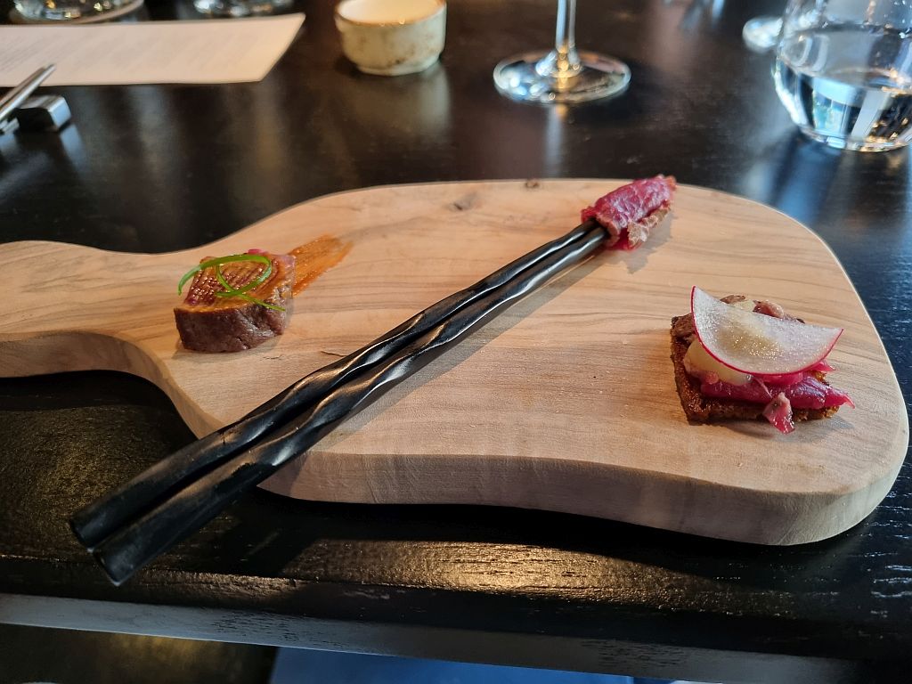 Und die Überraschungen nahmen nicht ab, denn als nächstes gab es Dreierlei vom Rindfleisch: Einmal als Tartar auf einem Sauerteig-Brot, einmal roh um die Stäbchen gewickelt und einmal mit einem koreanischer Gochujang bestrichen.