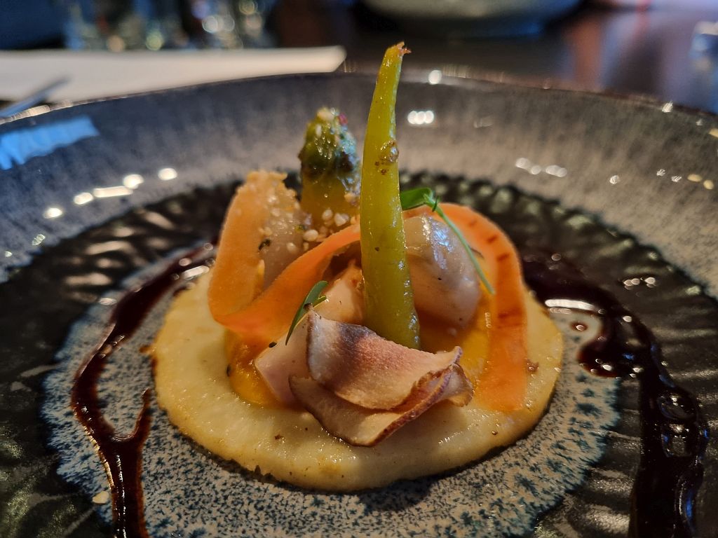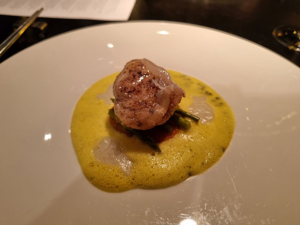 Beim Hauptgang waren wir dann wieder sehr zufrieden, denn der war auf Par mit den ersten Gängen. Es gab ein schönes Stück Seeteufel (einer unserer Lieblingsfische) mit Lardo umwickelt, Polenta und Amazake-Schaum, also aus einem süßen Sake.
