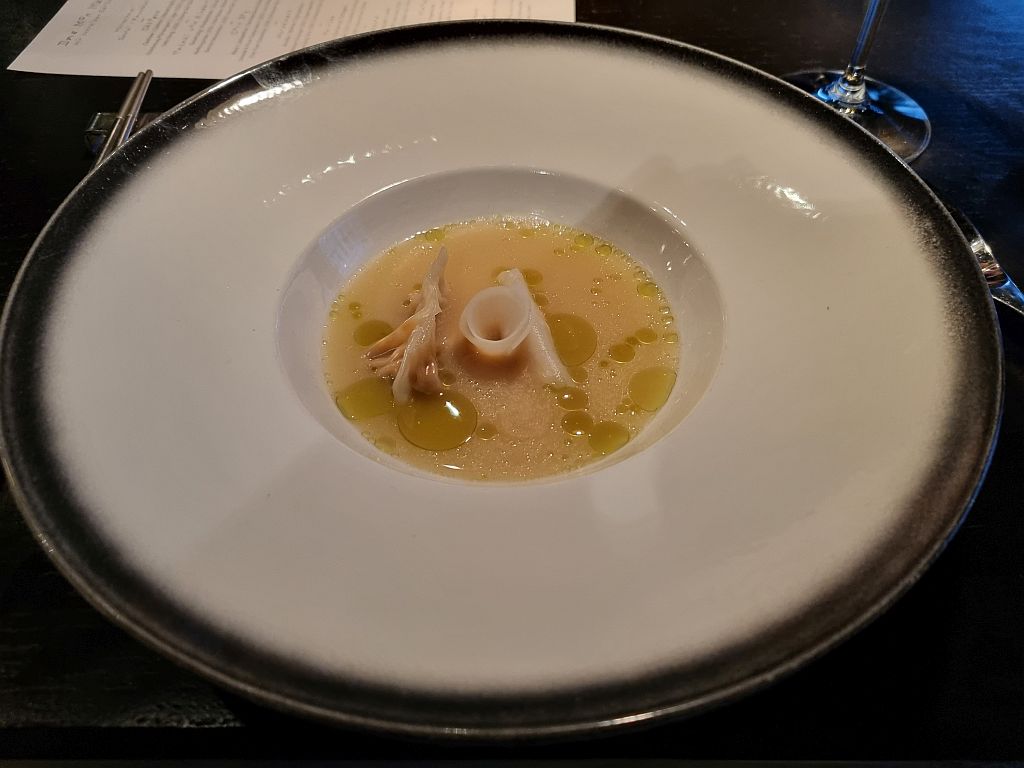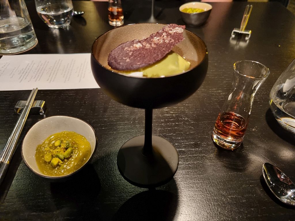 Das war echt, echt gut! Der Fisch war perfekt gegart, der Lardo schmolz dahin und der Schaum half alles zusammen zu führen. Dazu ein Riesling aus der Pfalz und ein gelber Tee aus China, die beide auf ihre Art und Weise zum Gang passte.