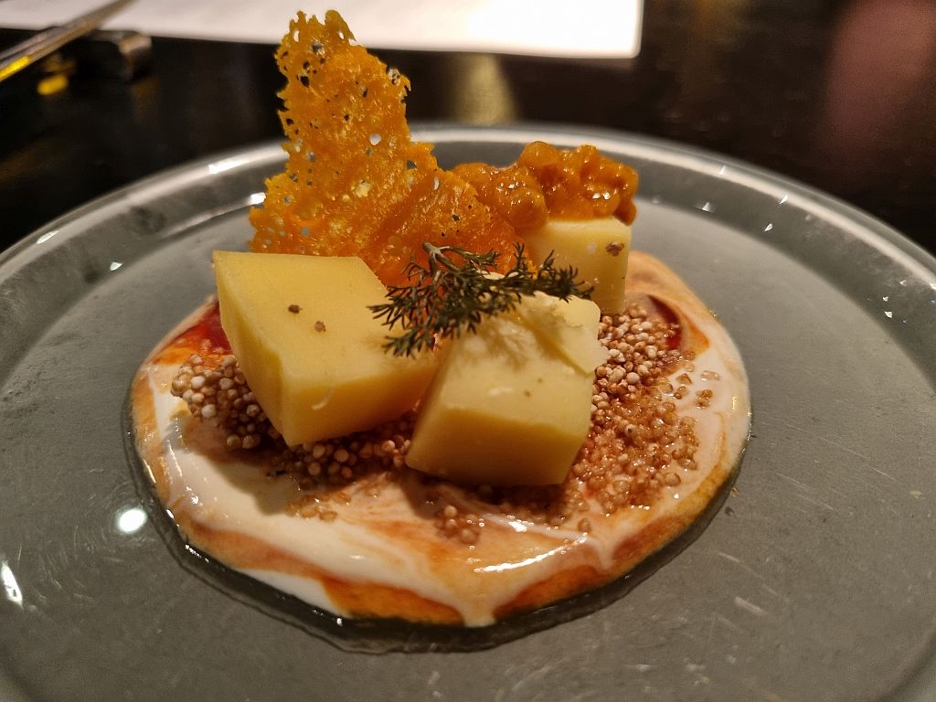 Kreativ war der erste Nachtisch auch, nur bestimmt nicht für jeden. Denn hier wurde Comte und Gruyere mit einem Hagebutten-Joghurt und Amarant gemischt.