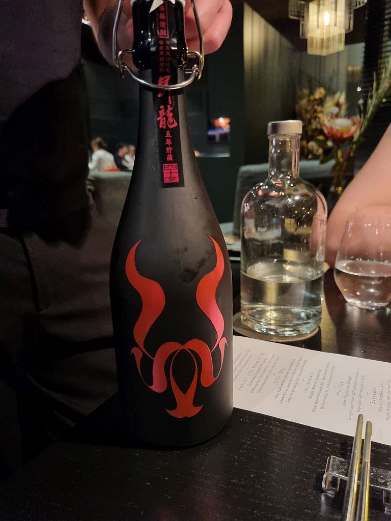 Der Wunsch nach einem letzten Digestif (ja, so hatte es gestern auch angefangen) wurde entsprochen und eine dem Namen diese Blogs angemessene Flasche fand ihren Weg an unseren Tisch: Ein Shochu aus Koji und Muscovado, gemischt mit 5 Jahre in Eichenholz gelagertem Shochu aus der Provinz Kagoshima.