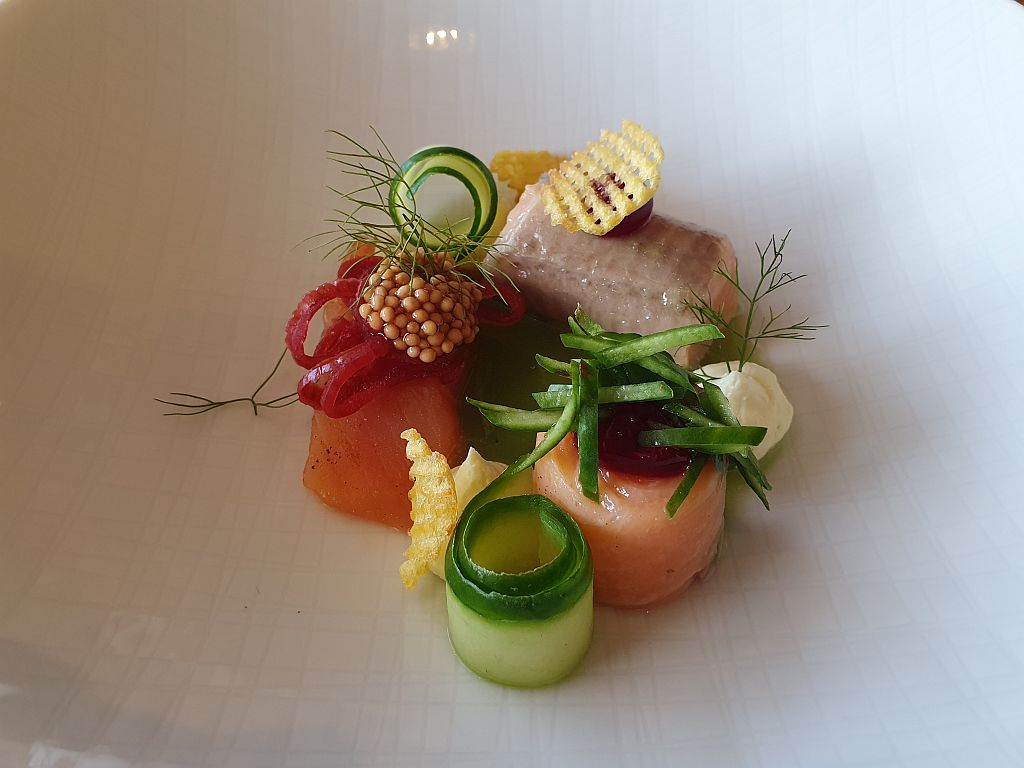 Erster Gang war dann eine Forelle mit Meerrettich, Gurke und Zwiebeln. Farblich sehr schön, Geschmacklich eine nette Kombination aus Fisch-Fett, den gepickelten Zwiebeln und den recht rohen Gurken. Krosse Kartoffelchips und etwas Dill vervollständigten das Geschmacksbild.