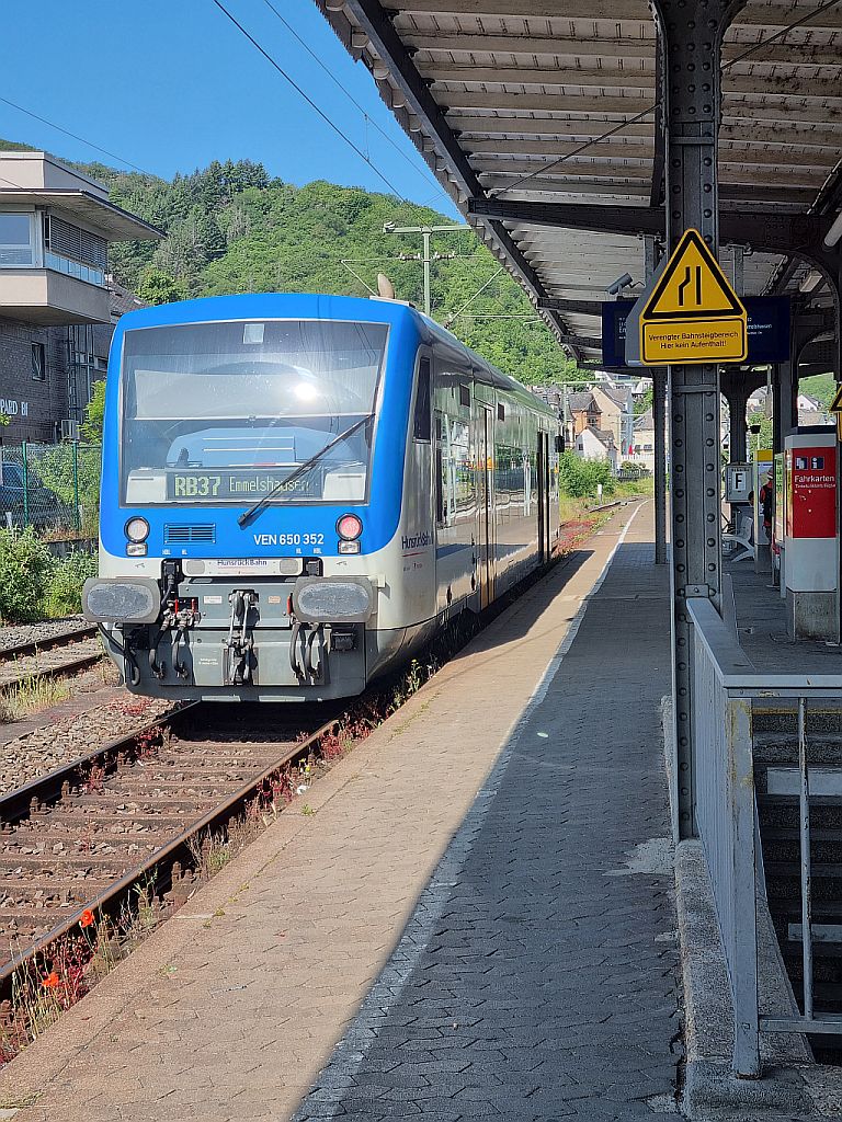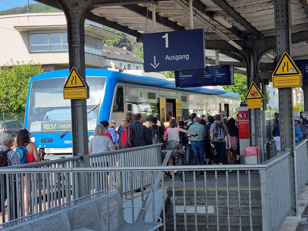 Pfingstsonntag, Wandertag! Nicht nur für uns, sondern auch für wohl so alle Menschen in Boppard. Zumindest die Menge an Menschen, die in die kleine Bahn nach Emmelshausen einsteigen wollen. Meistens inklusive ihrer Fahrräder.