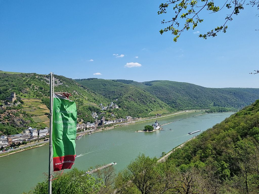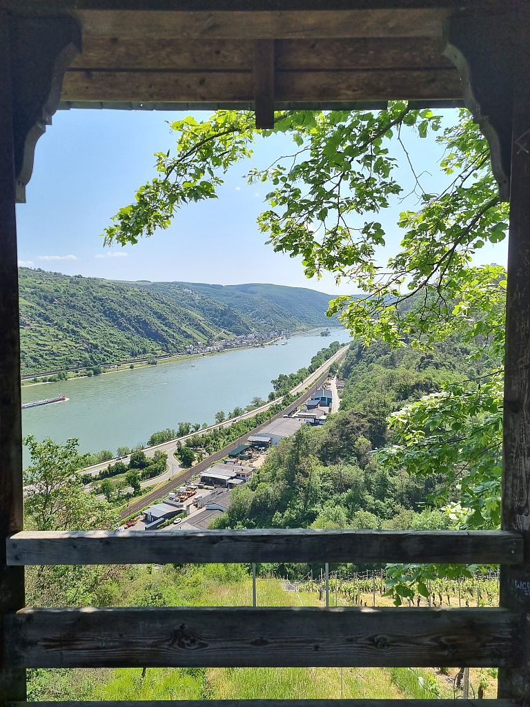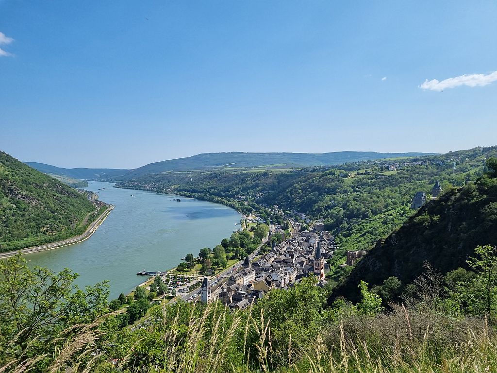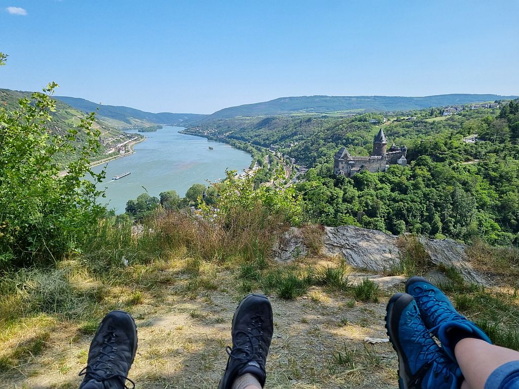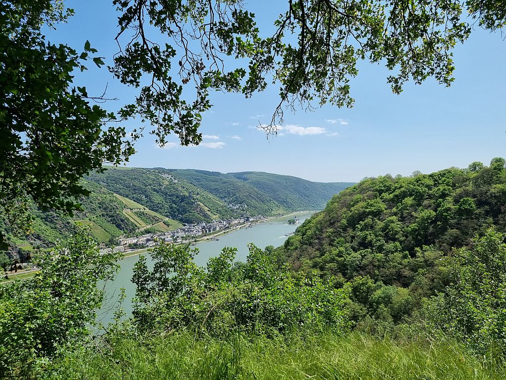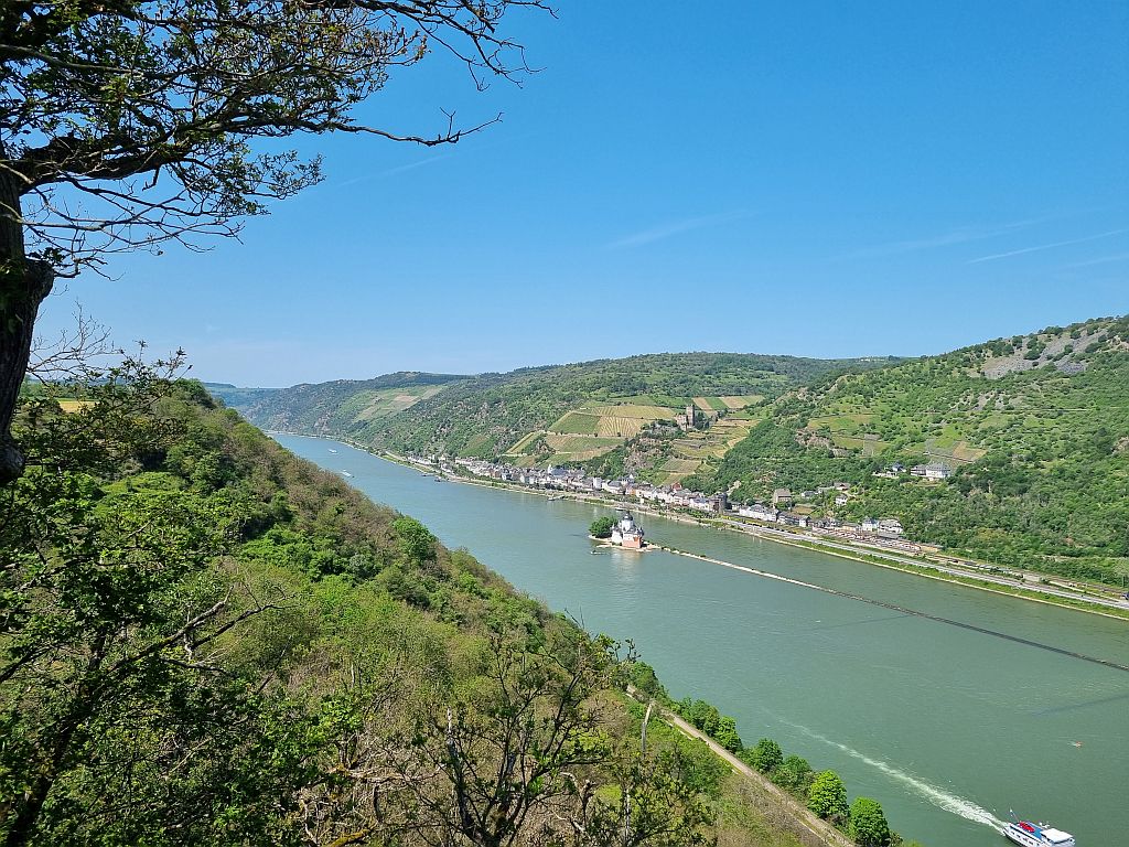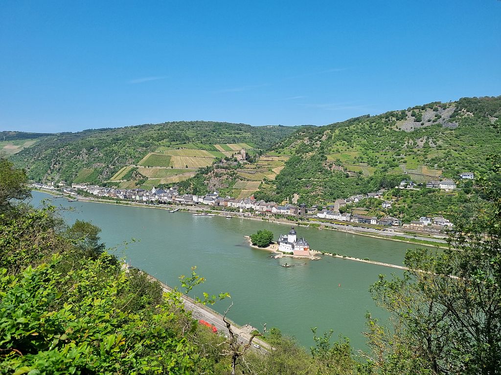 Und immer wieder unterbrochen von Ausblicken auf das wunderschöne Mittelrheintal wie hier gegenüber vom kleinen Ort Kaub.