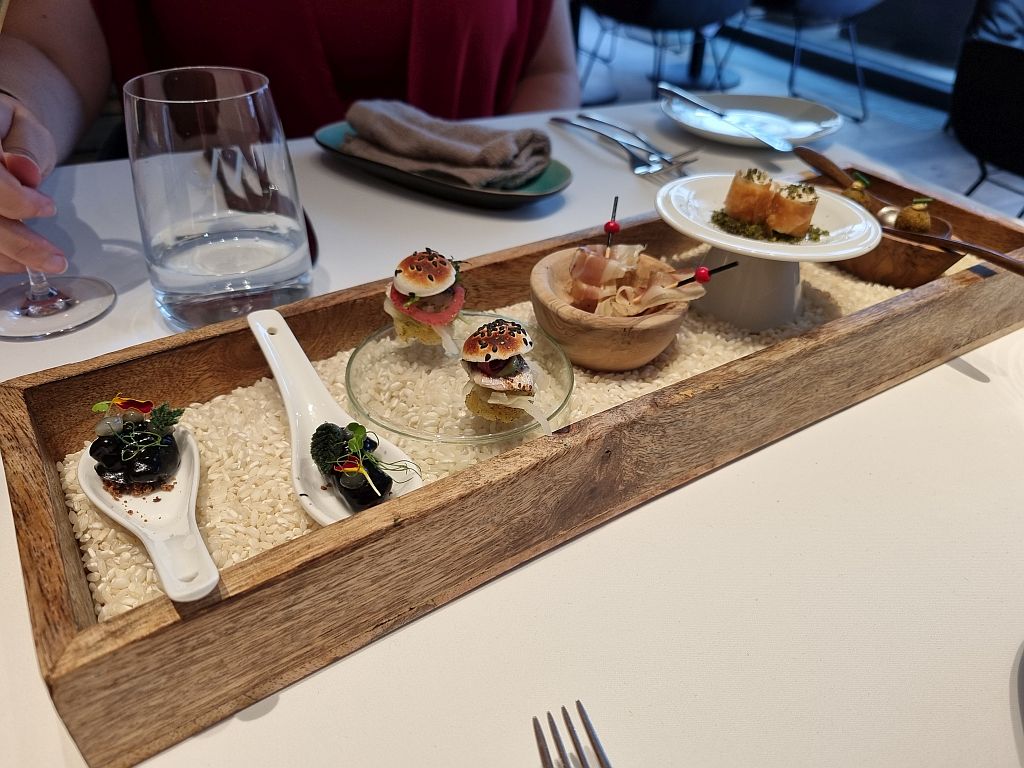 Als Appetitanreger gab es vier verschiedene Kleinigkeiten, von denen vor allem der kleine Aal-Burger in Erinnerung geblieben ist. Guten Schinken und zwei kunstvolle Amuse-bouche ergänzen diesen Gruß aus der Küche.