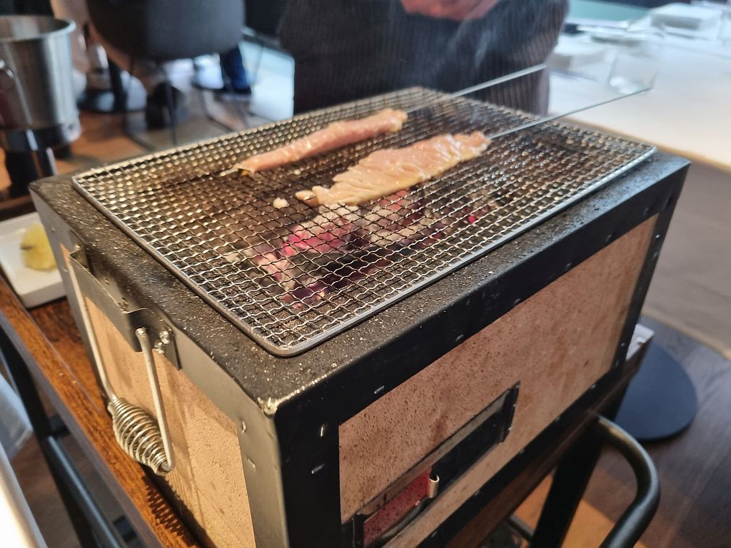 Der erste Gang wurde gleich mal zum Event, denn es wurde am Tisch eine Makrele gegrillt. Immer wieder mit den gleichen Witzen, wie wir nachher festgestellt haben. Aber mit Charme und Unterhaltung.