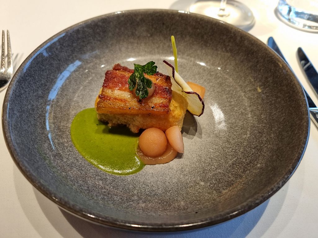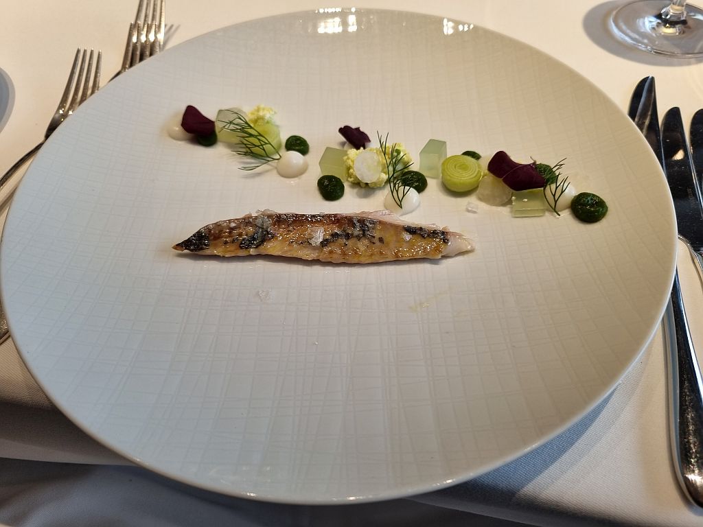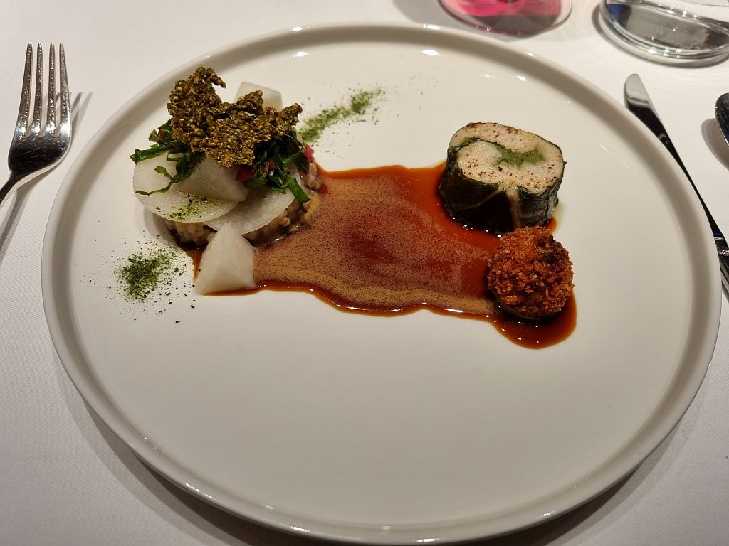 In der Kombination mit Tomate, Melone und Fenchel ein etwas kreativerer Gang und für uns der „schwächste“ von eigentlich nur starken Gängen. Bislang fanden wir eigentlich alles, inklusive dem Service, den Weinen und dem Ambiente sehr ansprechend und wir hatten eine gute Zeit.