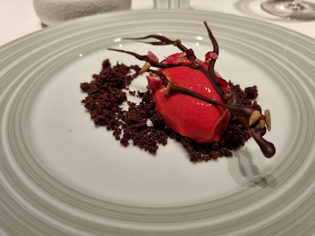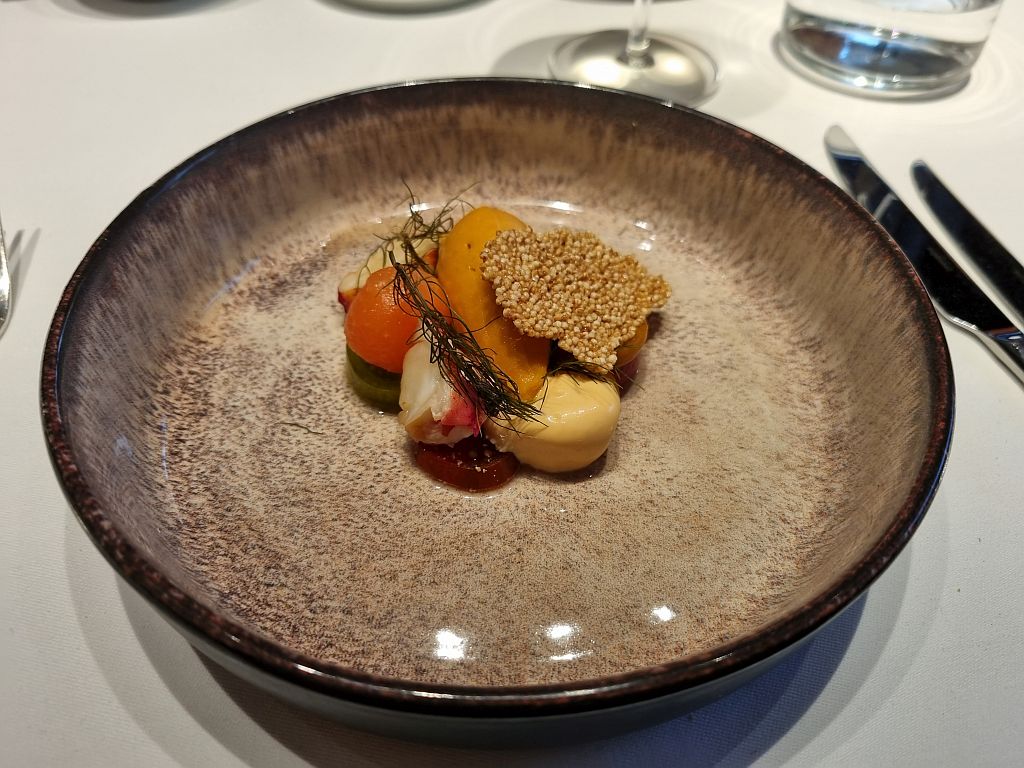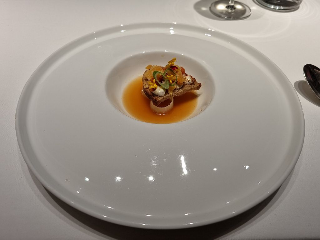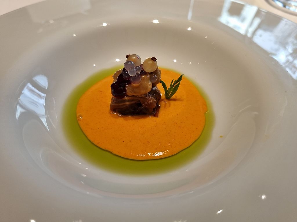 Ebenfalls wieder sehr fein gearbeitet, sehr klar in den Aromen und in der Kombination schon stark, wenn auch etwas zu sauer für unseren Geschmack. Wobei wenn man genug von der Aubergine mit den Beeren gegessen hat, war es nicht zu viel Säure – die Gefahr bestand nur bei zu vielen Beeren und Essig auf dem Löffel.
