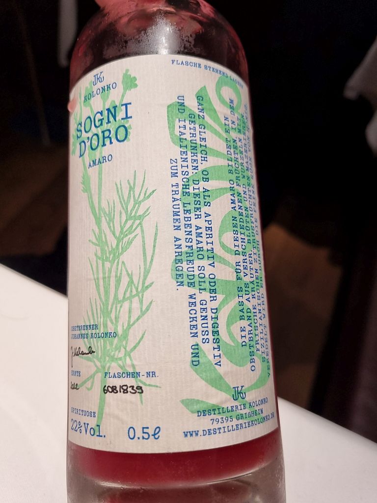 Zum letzten Gang gab es dann zwei verschiedene Getränke. Jens entschied sich für einen relativ teuren Sogni d´oro amaro, einen Obstbrand mit Kräuter, Blüten und Wurzeln gemeinsam mit Zitrusfrüchten verarbeitet wurden. Eine seltener Genuss für uns aber dem echt schönen Abend angemessen.