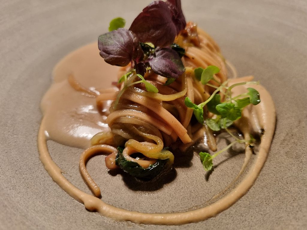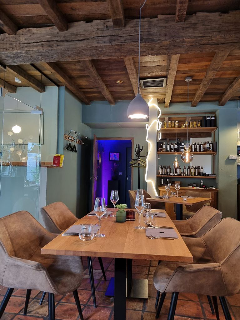Das Restaurant gibt es schon etwas länger, seit 2023 wurde man aber mit einem roten Macaron im Reiseführer ausgezeichnet und dabei wurde die regional fokussierte Karte gewürdigt. Man arbeitet hier fast nur mit regionalen Produzenten zusammen und lässt bei zwei, drei Bauern sogar explizit für das Restaurant Gemüse anbauen.