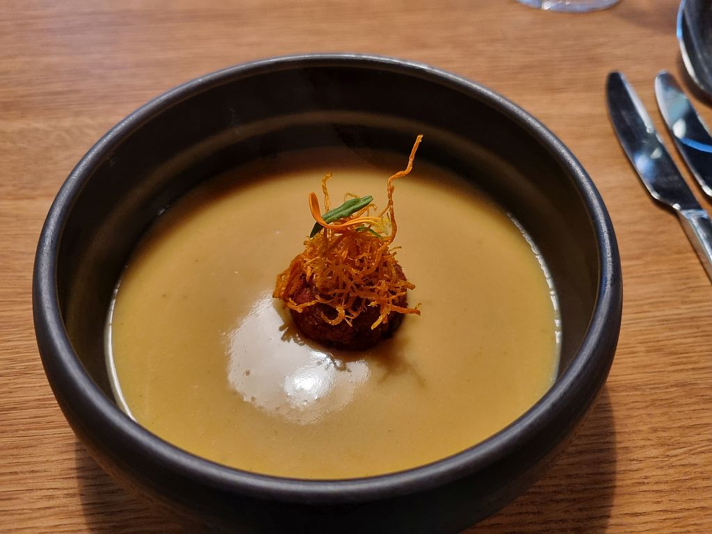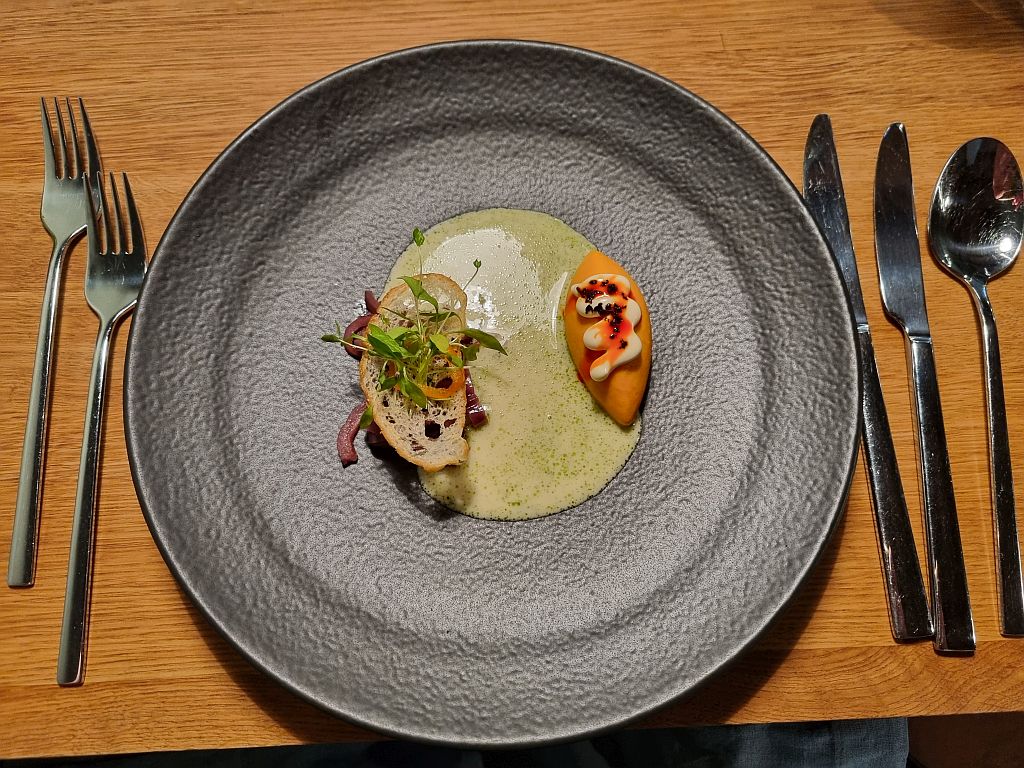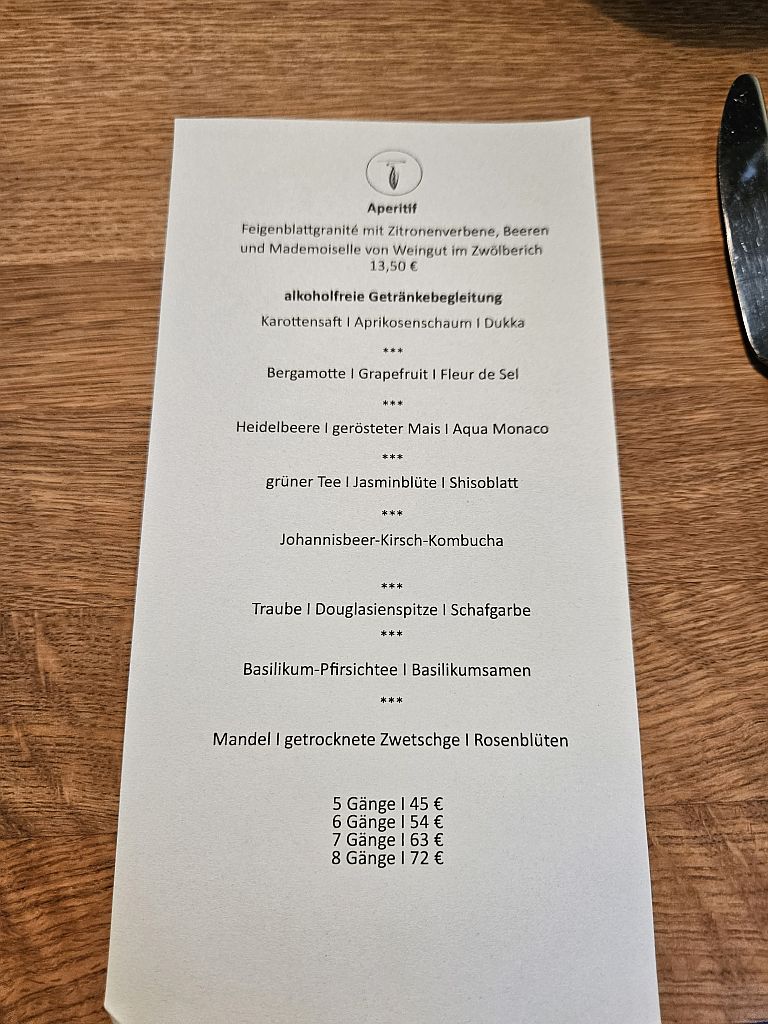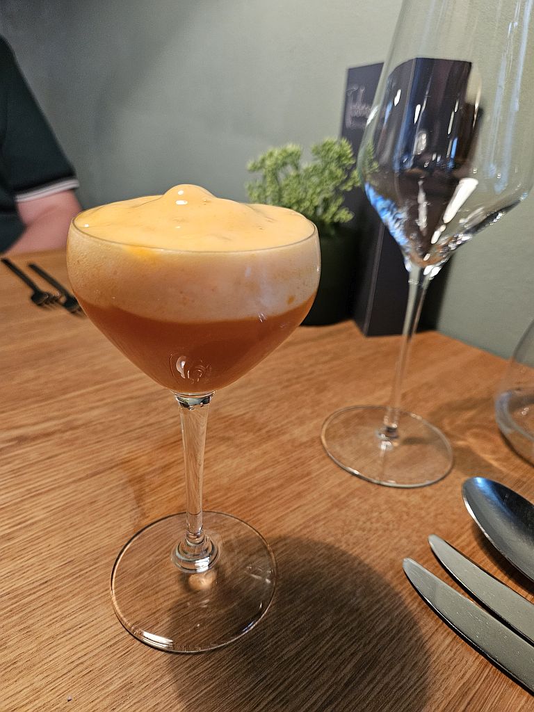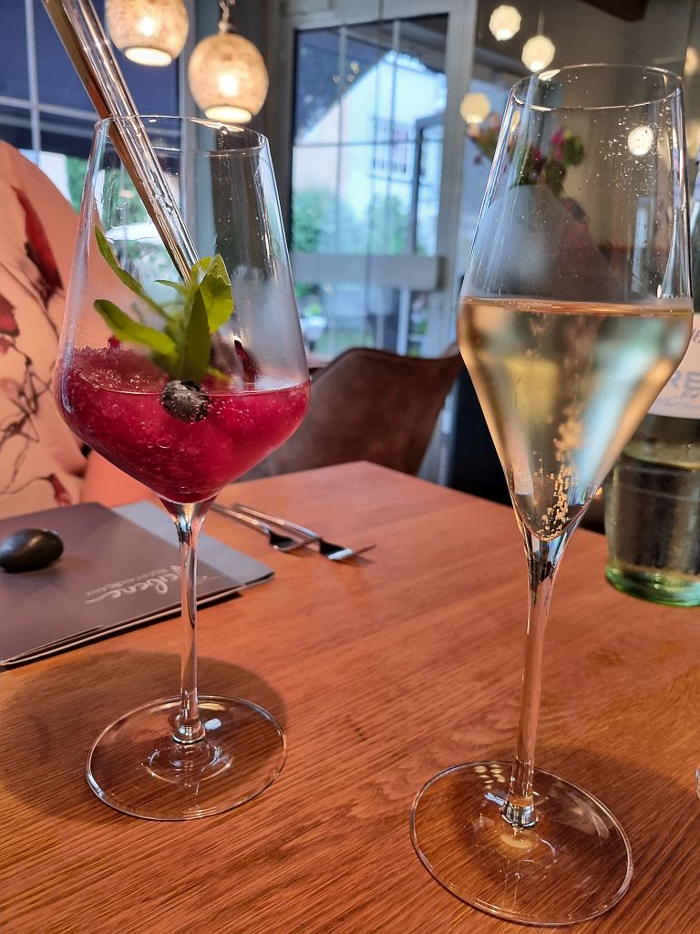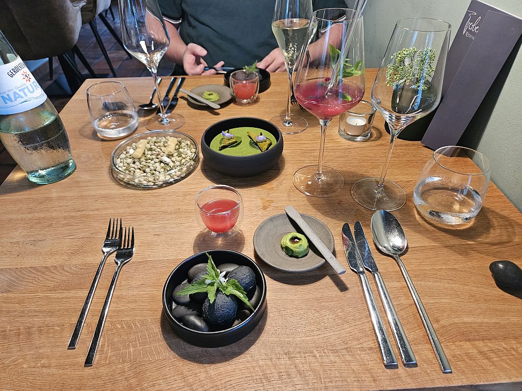 Mit der Begleitung gingen wir dann getrennte Wege, denn Meike hatte Lust auf die ebenfalls sehr kreative alkoholfreie Begleitung, die hier ungewöhnlicherweise angeboten wurde. Hier wurden sogar passend kreierte Kombinationen zu jedem Gang angeboten, wohl ein Faible des Sommeliers, wie er uns auch nachher bestätigte.