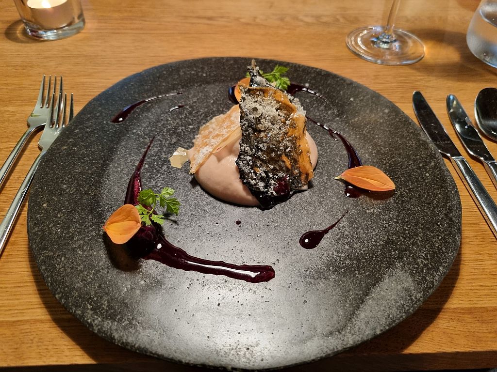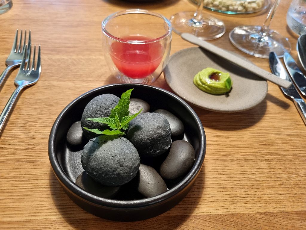 Dann kamen auch schon die Grüße aus der Küche, sehr kreativ fanden wir besonders die in Asche gewälzten Brötchen, wo man schon kurz hinschauen musste. Ich sage nur „Lass uns ‚Brötchen oder Stein‘ spielen“ …