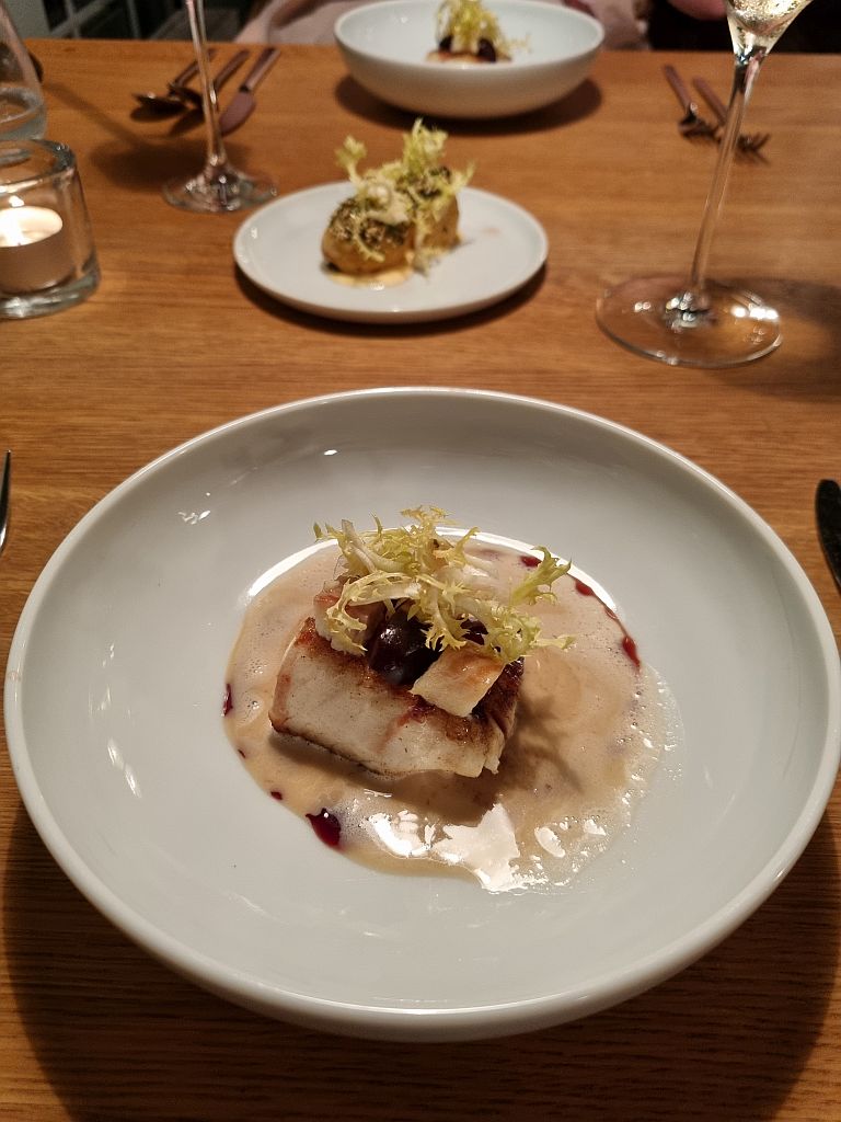 Generell waren bei allen Gerichten die Kombinationen spannend und gut gewählt, ohne die Teller zu komplex werden zu lassen. Ein Trend, der sich auch beim nächsten Gang, dem gebratenen Zander, dem Räucheraal, den geräucherten Kirschen und ein bisschen Frisée-Salat zeigte.