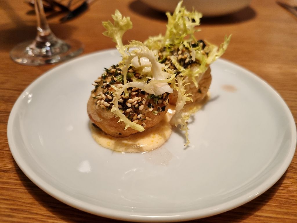 Spannend insofern, als das „Voie Gras“ kein Tippfehler ist, sondern eine von Nestle auf den Markt gebrachte, vegane Alternative zur Gänsestopfleber, die aus Miso, Soja und Salz hergestellt wird. Schmeckte schon ganz gut, auch wenn die Intensivität der „richtigen“ Gänsestopfleber noch stärker ist. Allerdings spannend und zu loben, dass sich mit sowas beschäftigt wird und noch mehr, dass es hier Einsatz findet.