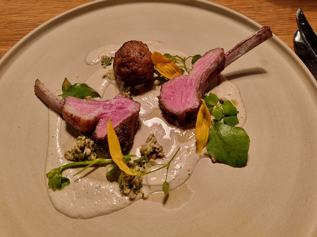 Hier verließen wir Asien, was bislang ein wenig der Schwerpunkt des Menüs war, und gingen in den Nahen Osten, zumindest von den Aromen her. Das Lamm, wie man sehen kann, war sehr gut zubereitet. Die Minze und der Joghurt sind da natürlich ein klassischer Begleiter. Die kleine Lamm-Frikadelle war quasi ein Bonus und brachte noch eine weitere Lamm-Komponente dazu.
