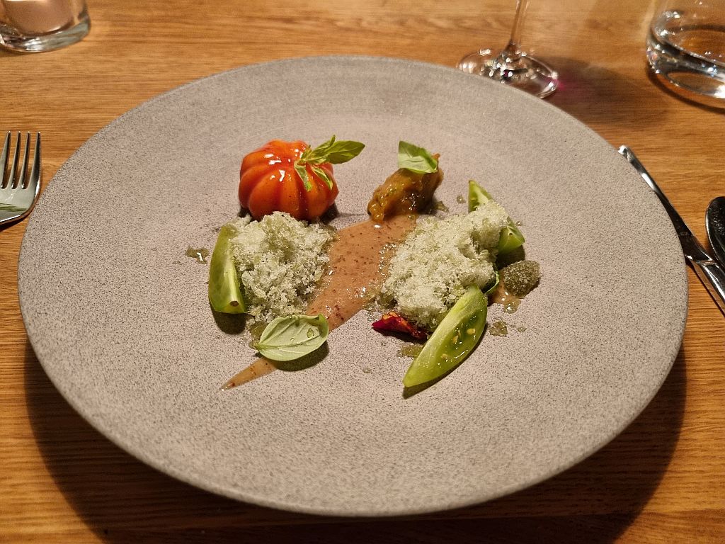 Zeit für den Nachtisch, wo der erste Teller das Thema „Tomate“ hatte. Verschiedenen Tomaten und ein Granite aus Basilikum. So einfach und doch so lecker, so sinnvoll, so schön.