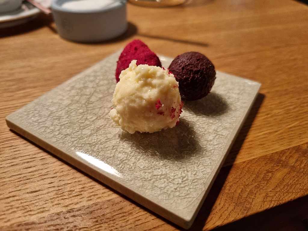 … drei kleine Pralinchen, die aus der eigenen Manufaktur des Verbene stammen. Eine Art kleines, zweites Standbein, denn die Pralinen kann man auch separat kaufen.