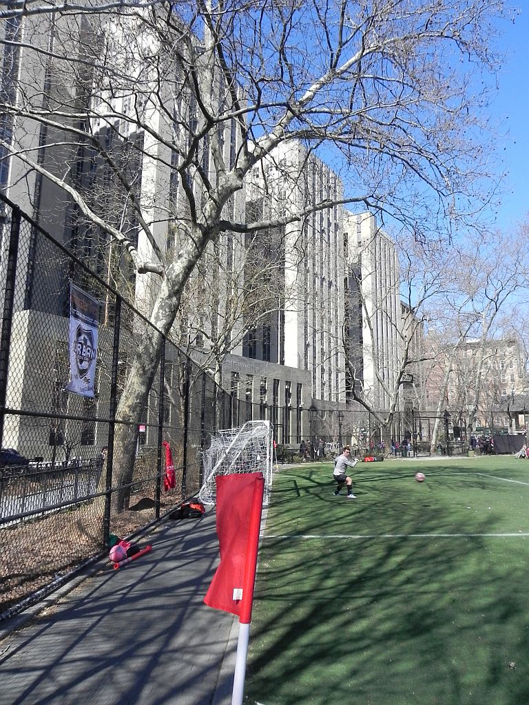 Und inmitten der ganzen Gebäude, ein Park mit Hunderten von, da Chinatown direkt um die Ecke ist, Mahjong-Spielern die tatsächlich um Geld spielen. Direkt daneben im übrigen das Gerichtsgebäude. Und dabei direkt ein Fussballplatz, wo gemischte Teams in einer lokalen Liga gegeneinander gespielt haben.
