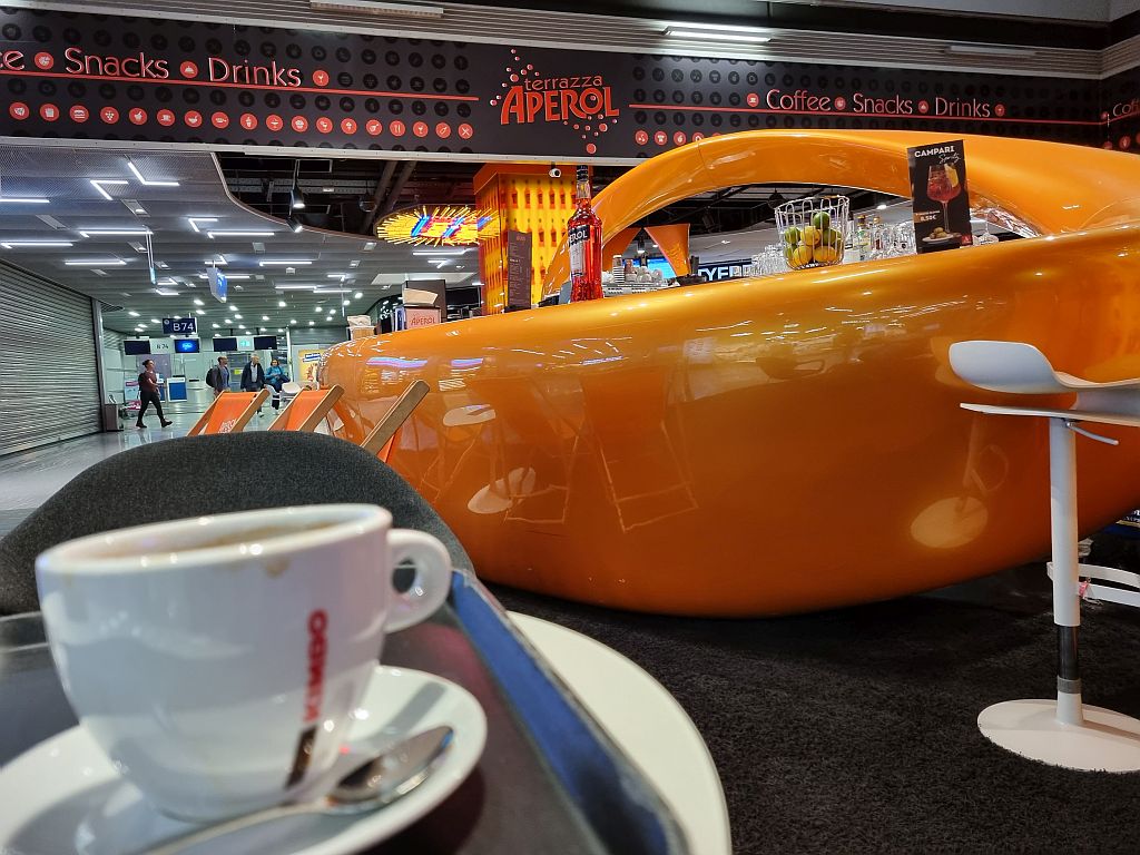 Nach einer Weile waren wir dann durch und brauchten erst einmal was, um wach zu werden. Und zur Beruhigung. Da wir ja nicht mit einer Fluggesellschaft der Star Alliance unterwegs waren, gab es keine Lounge und demnach auch keine Ruhezone. Also setzten wir uns an eine formschöne Aperol-Bar und tranken einen Espresso (Jens) und eine Cola (Meike). Und versuchten die ganzen latent betrunkenen Gruppen zu ignorieren, die zu den Gates in Richtung Palma, Ibiza oder Gran Canaria torkelten.