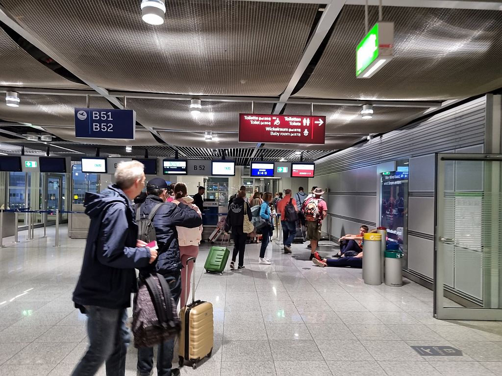Jens war so genervt, dass sogar überlegt wurde, zu einem Gate mit einer längeren Wartezeit zu gehen, um diesem Lärm zu entgehen. Am Ende wurde eine weibliche Gruppe sogar von der Bundespolizei aufgefordert, die Musik aus zu schalten. Was dazu geführt hat, dass sie gesungen haben. Schlecht, laut und dumme Lieder.