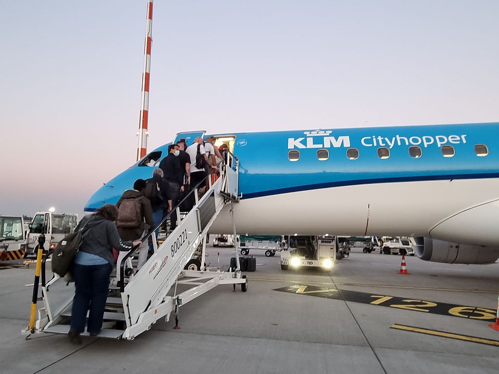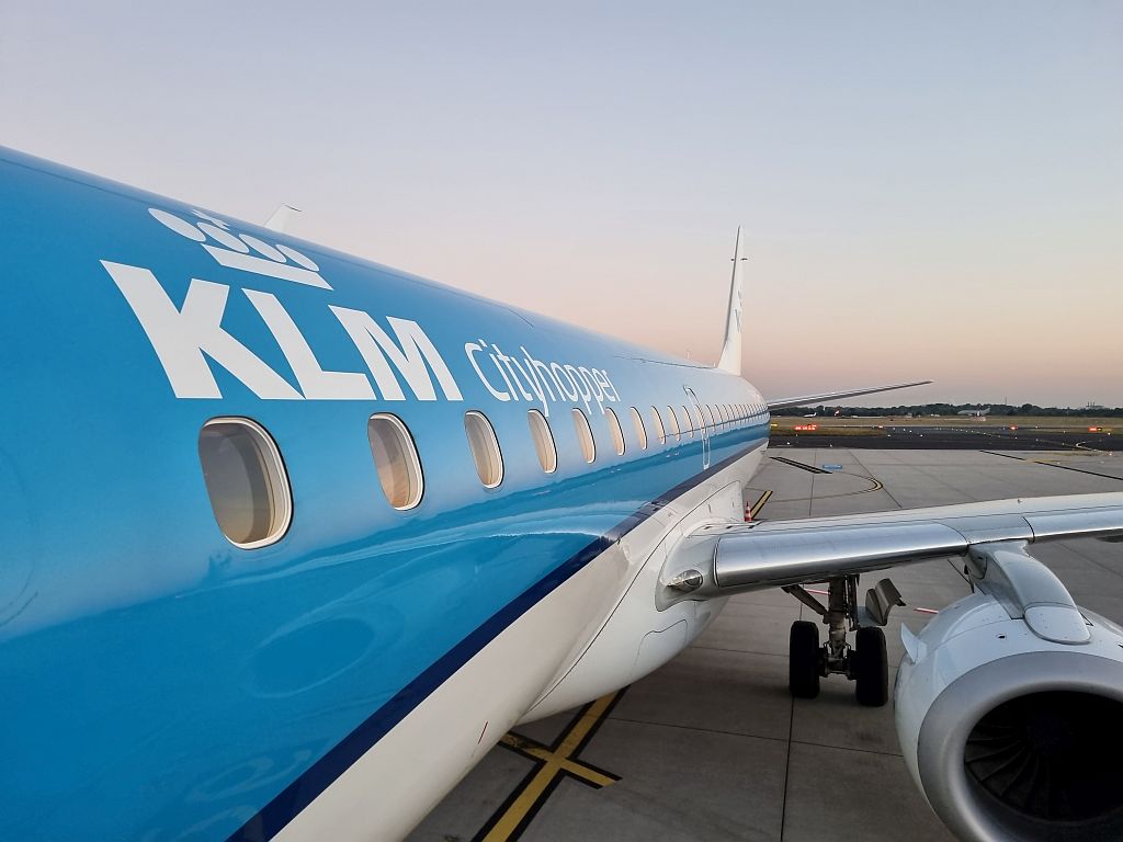 Na gut, mit dem Bus ging es dann zu einem kleinen Cityhopper. KLM fliegt ja leider nicht mehr diese ganz kleinen Fokker Flugzeuge – die hat Jens immer begeistert, wenn er mit seinen Eltern am Flughafen war. Aber auch so gut, denn die Embraer Maschinen sind auch schön.