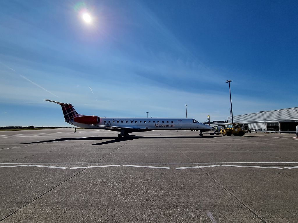 Neben und die kleinen Flugzeuge der schottischen Fluggesellschaft Loganair. Schönes Schotten-Karo auf dem Heck.