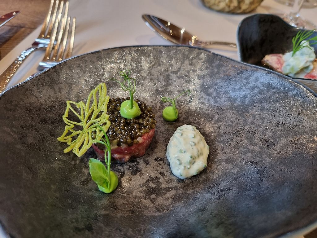 Voller Geschmack und gerade die Erbse mit dem Tartar ging genau in unsere Richtung. Der Kaviar war hier eher schmückend, auch wenn der Hauch Salzigkeit gut zum fast ungewürzten Tartar passte. Sehr lecker.