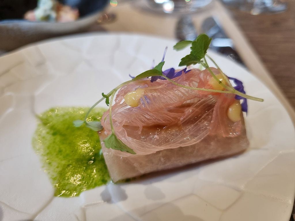 Der zweite Teller beinhaltete ein Involtini vom Hamachi, also der Gelbschwanzmakrele. Dazu geeister Rhabarber und Meerrettich.