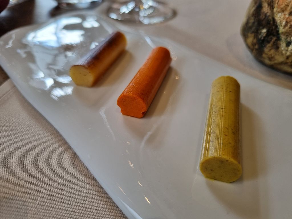 Zum Sauerteigbrot gab es drei verschiedene Butter-Varianten: Braune Butter, Paprika-Tomate und Curry. Wir vermissen ja ab und an den Buddha-Kopf mit der Creme, aber auch hier gilt: Stillstand ist Rückschritt und Veränderung ist erwünscht.