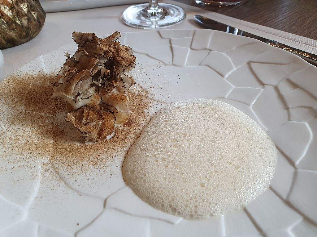 Mille-feuille ist ja eigentlich ein französischer Kuchen aus geschichtetem Blätterteig, der verschiedenartig gefüllt ist. Chef Marlon verwendet diese Technik, aber mit Sellerie und Parmesan. Dazu gibt es eine Vin Jaune, Sommertrüffel und Pilzpulver.