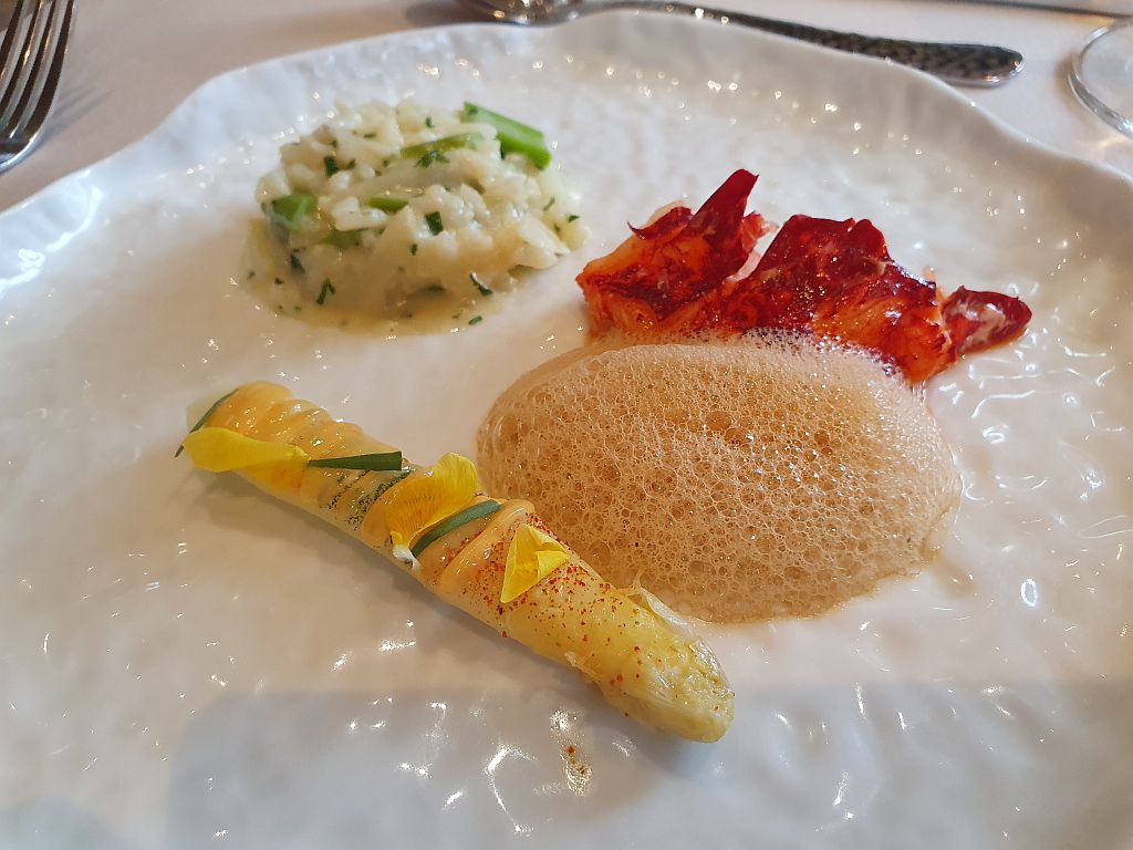 Weiter geht es mit dem bretonischen Hummer, einem Risotto, Spargel und einer Bisque.