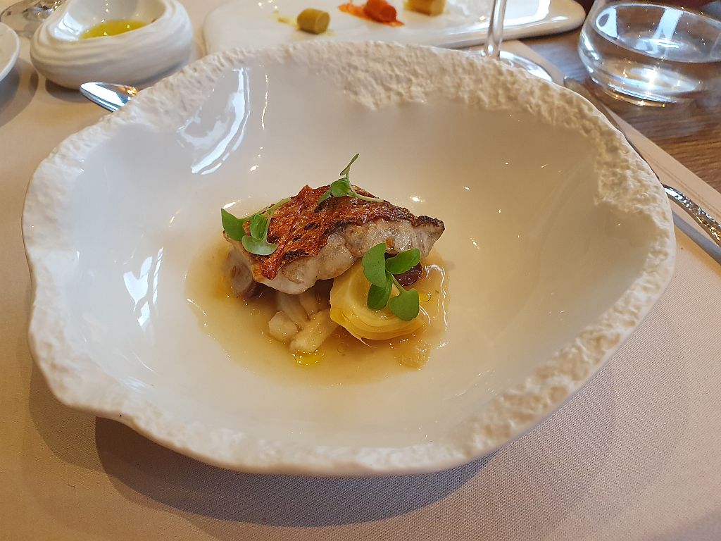 Meike als jemand, der ungerne Artischocken isst, fand den Gang eher nicht so lecker und im Gegensatz zu den anderen war er auch etwas unrund. Vielleicht wurde hier etwas ausprobiert, was noch etwas Feinschliff benötigt. Die Haut war aber der Knaller: Fest, nicht zu röstig und voller Geschmack. Die Artischocke war aber etwas dominant und so ging der Fisch da etwas unter, wenn man alles auf einmal in den Mund führte.